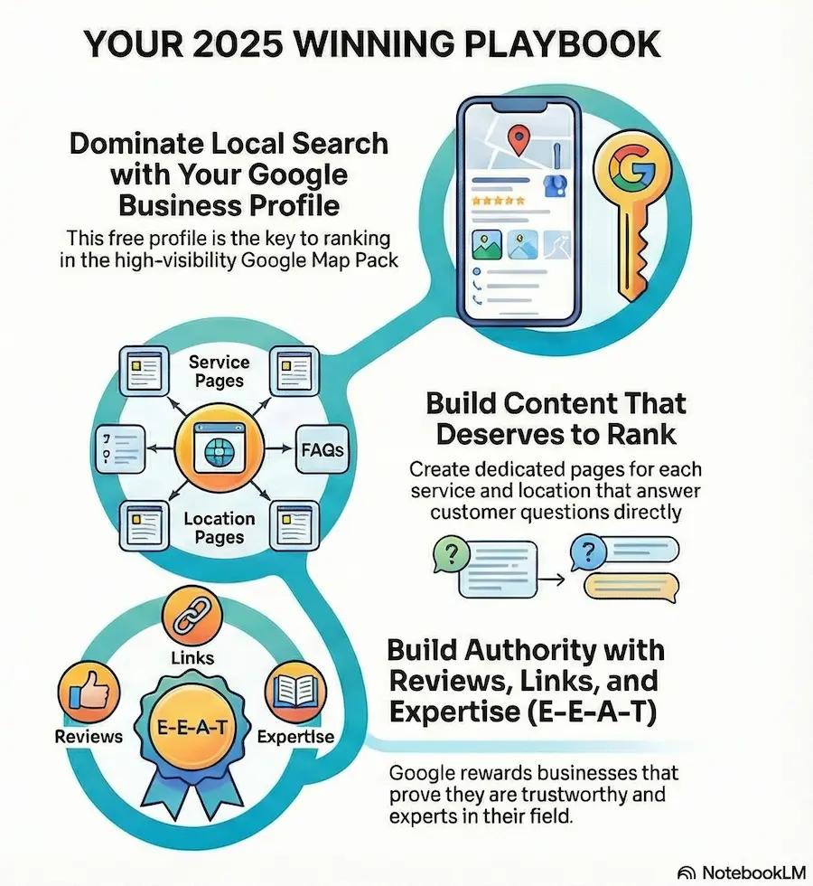 It means the definition of success has expanded. Winning in 2025 looks like this: Your business appears in traditional organic listings for your core services. If you’re local, you dominate the Map Pack for “near me” searches. Your content earns featured snippets and People Also Ask placements. For key informational queries in your industry, you’re cited as a source in those AI Overviews.