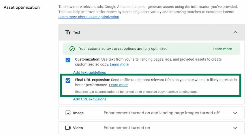 URL expansion is on by default and it’s one of the first settings to evaluate. When enabled, Google can send ad traffic to any page on your website, including your blog, your careers page, or your privacy policy. For most service businesses, that’s a problem. Turn it off if you have dedicated landing pages for paid traffic, or at minimum, use URL exclusions to block pages that have no business receiving ad clicks.