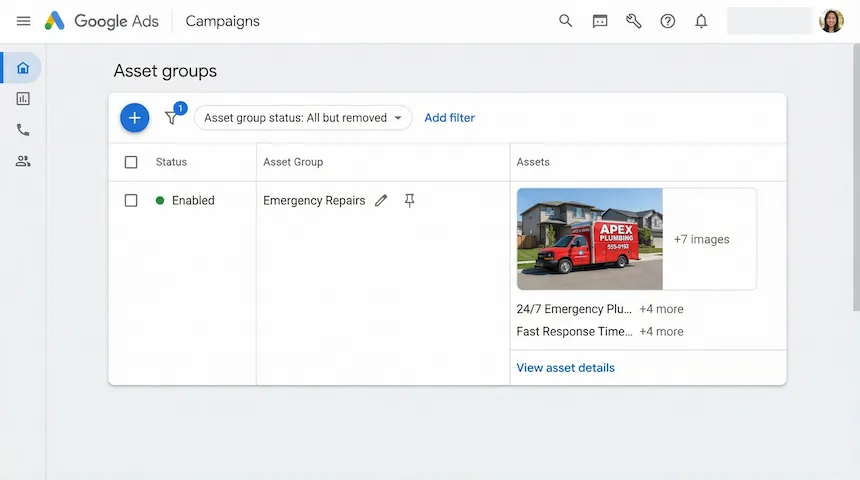 Within each campaign, organize your asset groups by theme. An asset group for “AC installation” gets headlines, descriptions, images, and audience signals that all point toward that service. A separate asset group for “furnace replacement” gets its own set. This gives the algorithm clear, distinct signals about what each group of ads should accomplish.