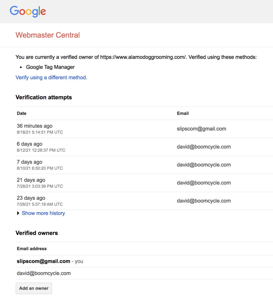 This loads the manage property owners screen where you can add a new verified user by clicking the add an owner button: