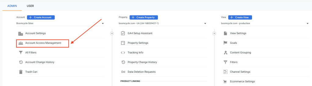 Now you’ll notice there’s a User Management link under every column. That’s because there are 3 levels of access: Account, Property and View: