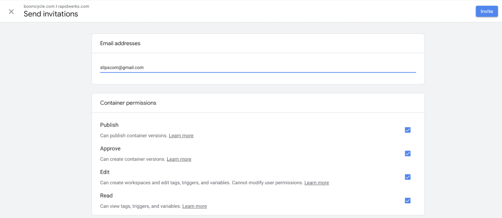 Finally, click the blue “Invite” button to send account access. Once they accept the invitation, your agency will then be able to start working in your Google Tag Manager account.